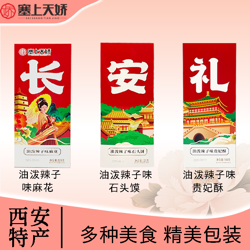 本礼盒精选三款经典陕西小吃,创新融入地道油泼辣子风味,呈现独具特色的味觉体验。礼盒包含油泼辣子味麻花、石头饼与贵妃酥,通过精心配比,展现陕西美食的独特魅力。